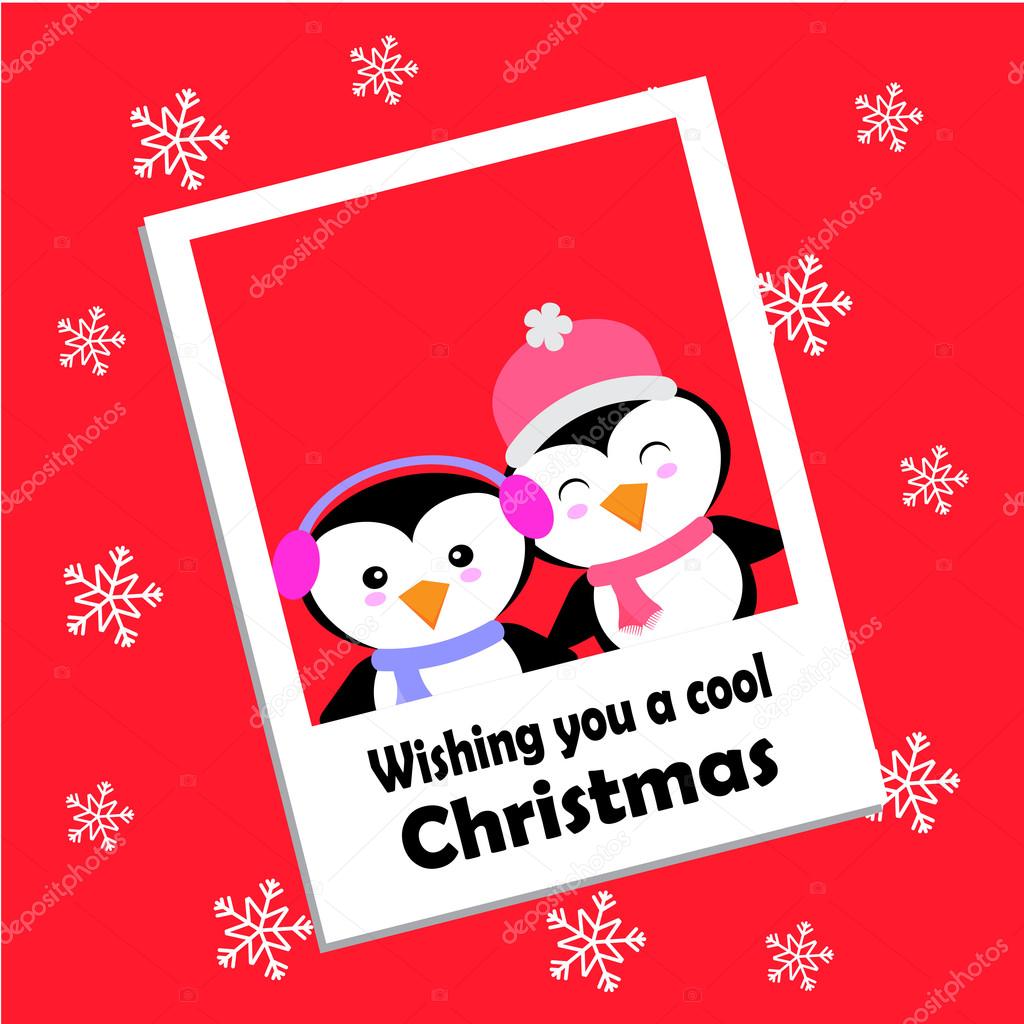 Christmas Illustration With Cute Penguins On Red Background