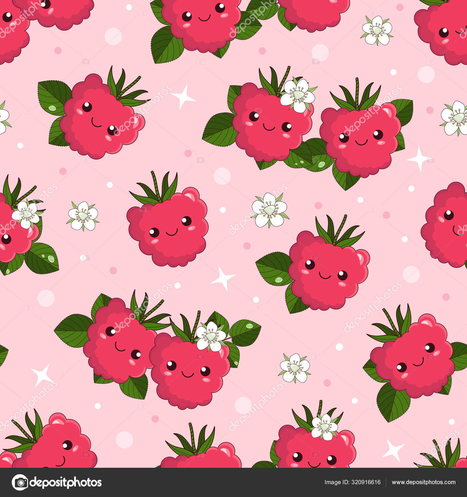 Smiling Cute Cartoon Berries Of Raspberry Seamless Vector Backg