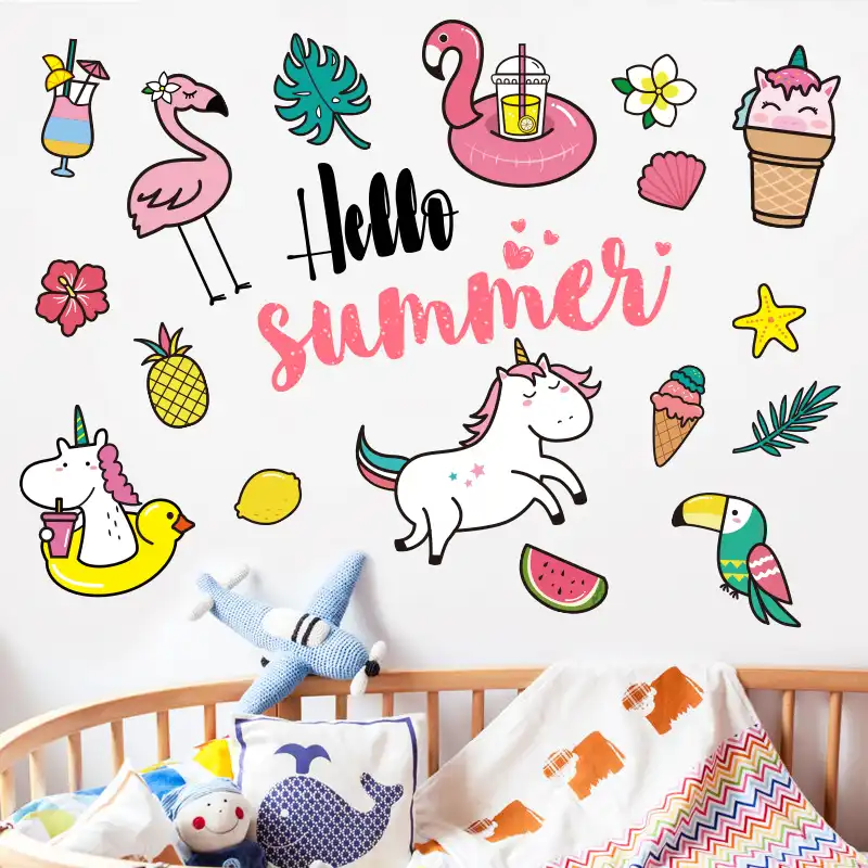 Unicorn Flamingo Cartoon Wall Sticker Cool Summer Fruit Kids Room
