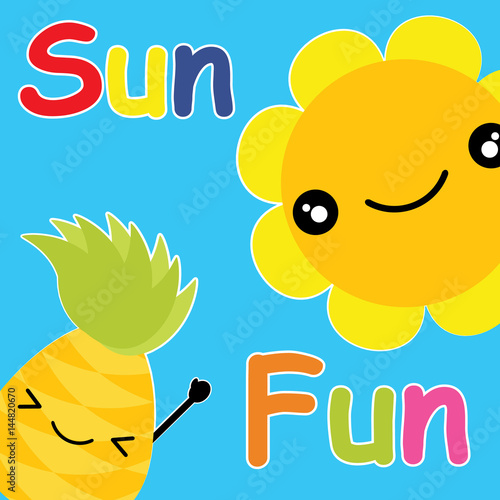 Cute Pineapple And Sun On Blue Background Vector Cartoon Summer